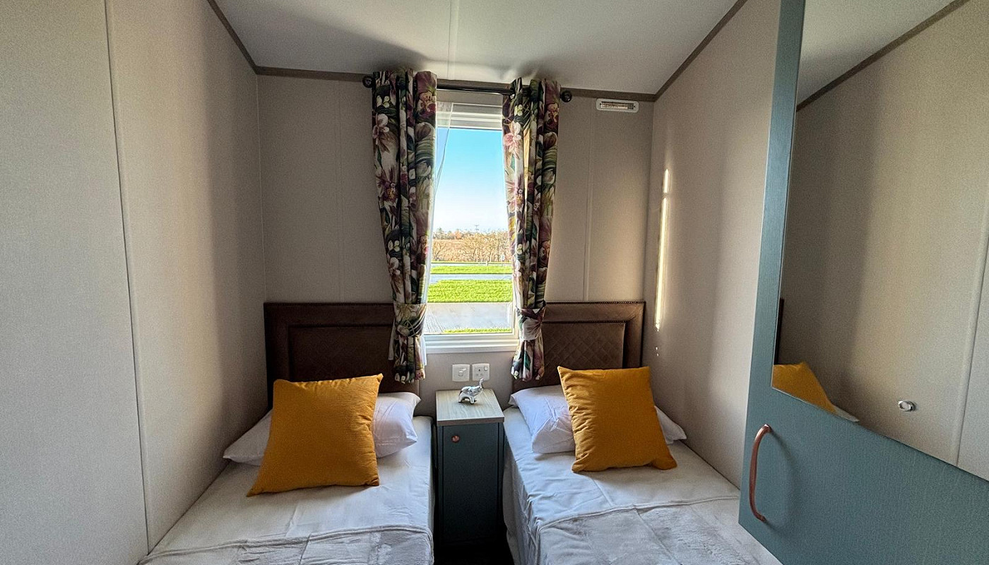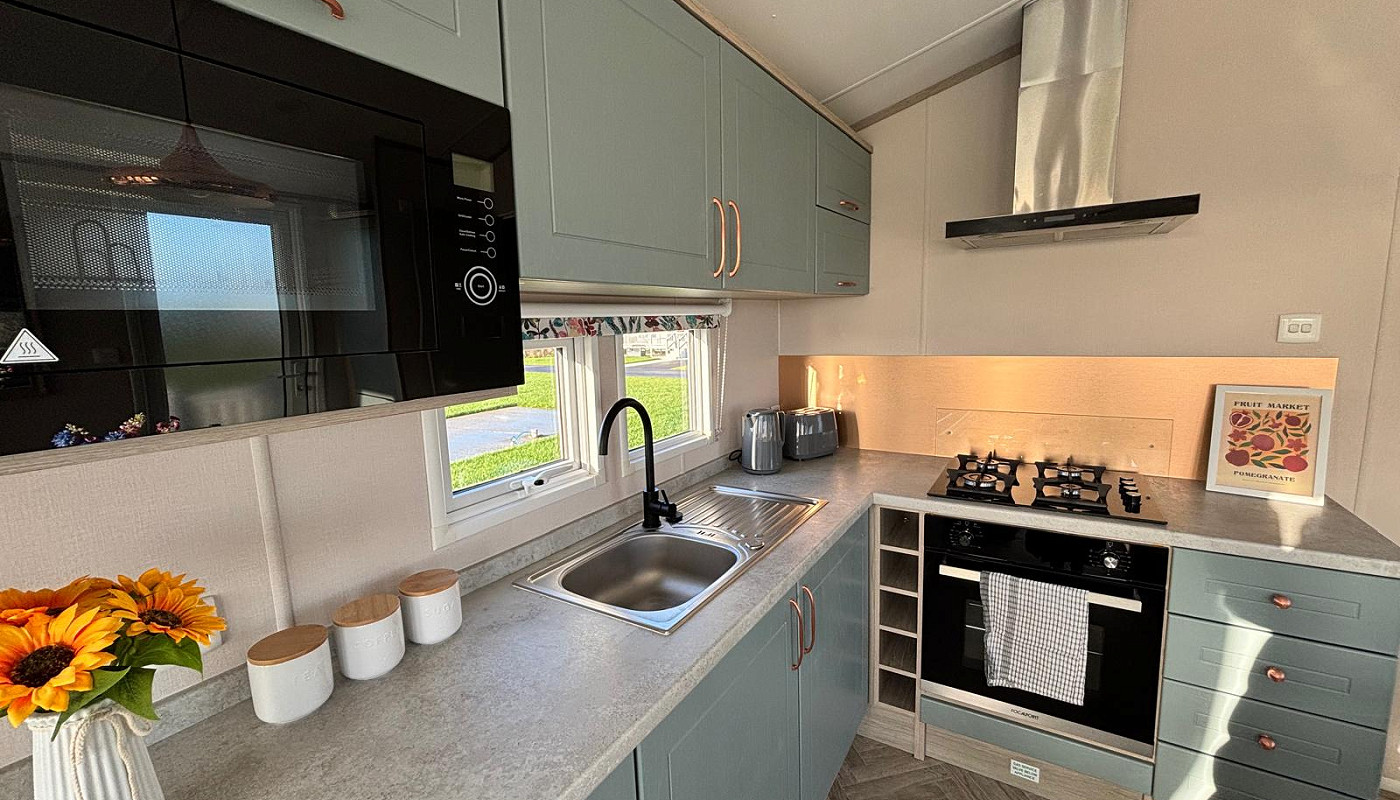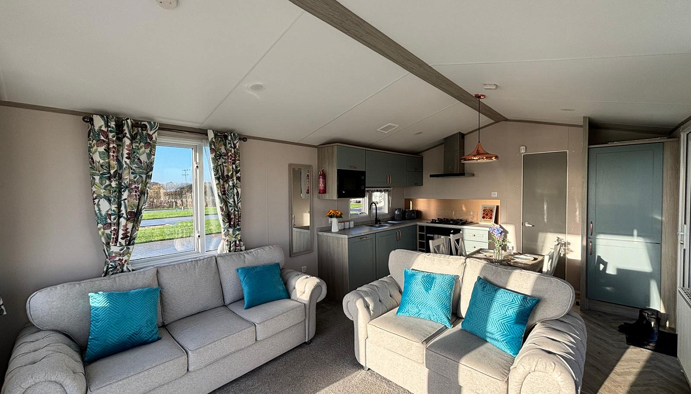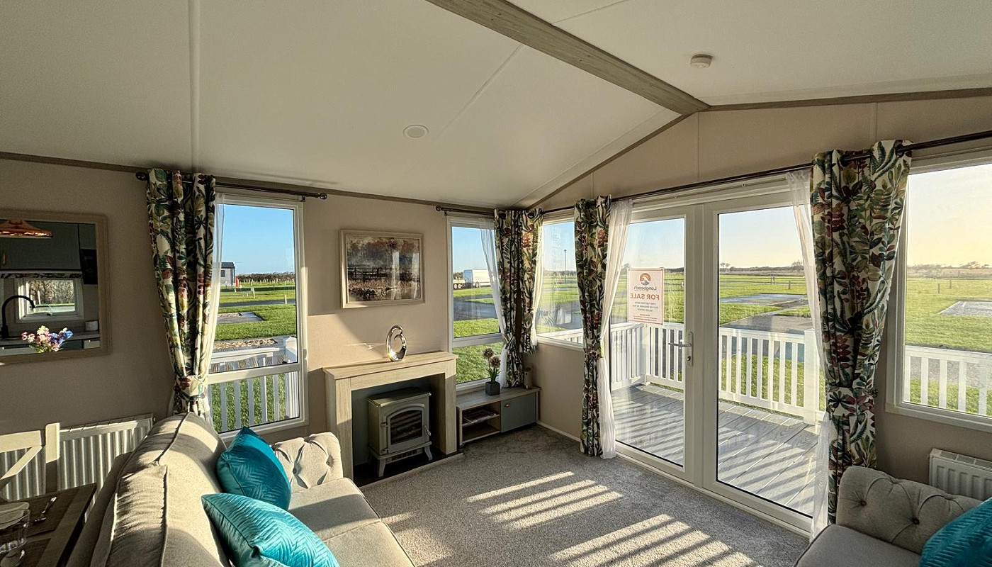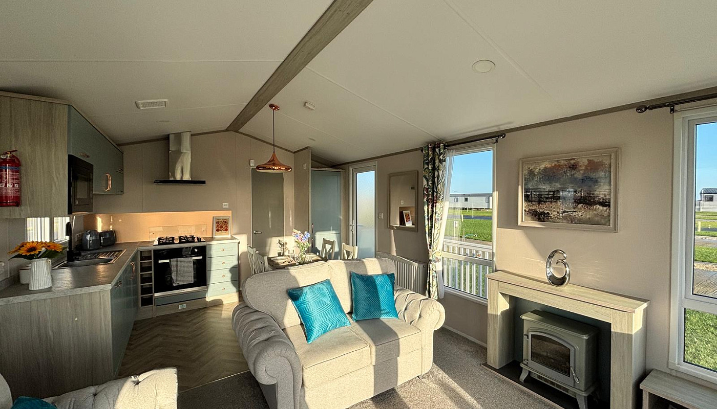Measuring 40’ x 12’, this spacious model offers three well-proportioned bedrooms, making it ideal for families or those who enjoy entertaining guests. The open-plan living area is enhanced by front-opening patio doors, allowing natural light to flood the space, while the electric feature wood burner stove creates a warm and welcoming focal point.