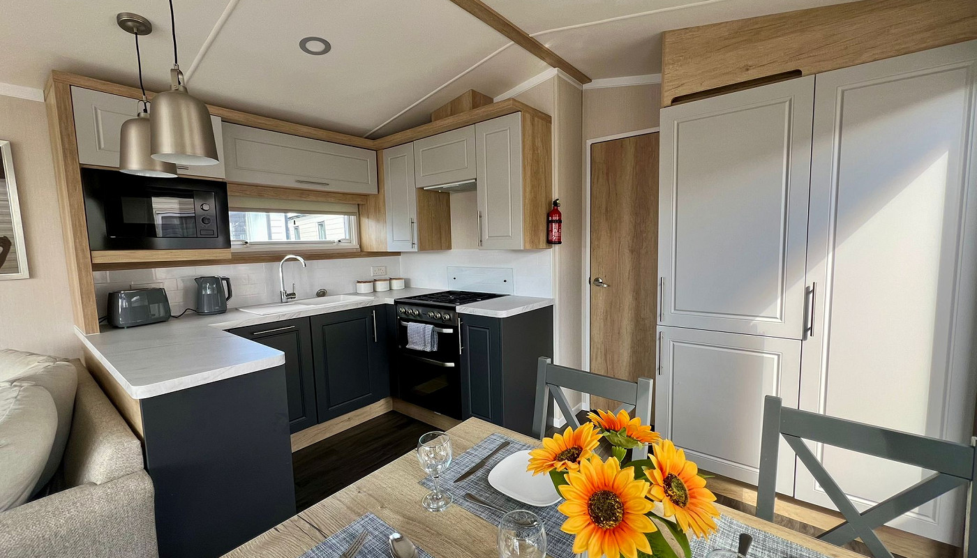The open-plan layout creates a bright and welcoming living space, with cosy seating and plenty of room for entertaining or unwinding. The kitchen is both functional and modern, offering everything you need for easy holiday living.