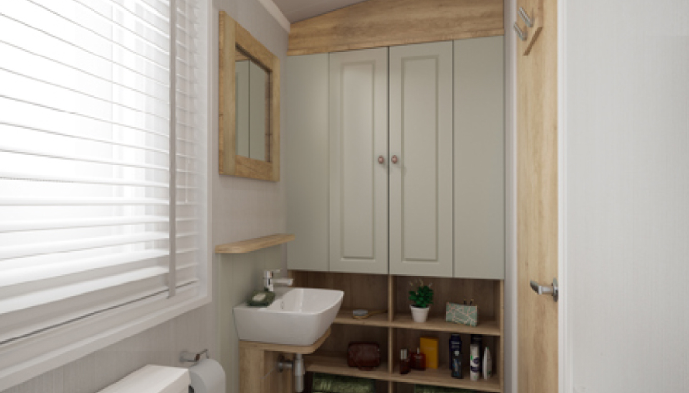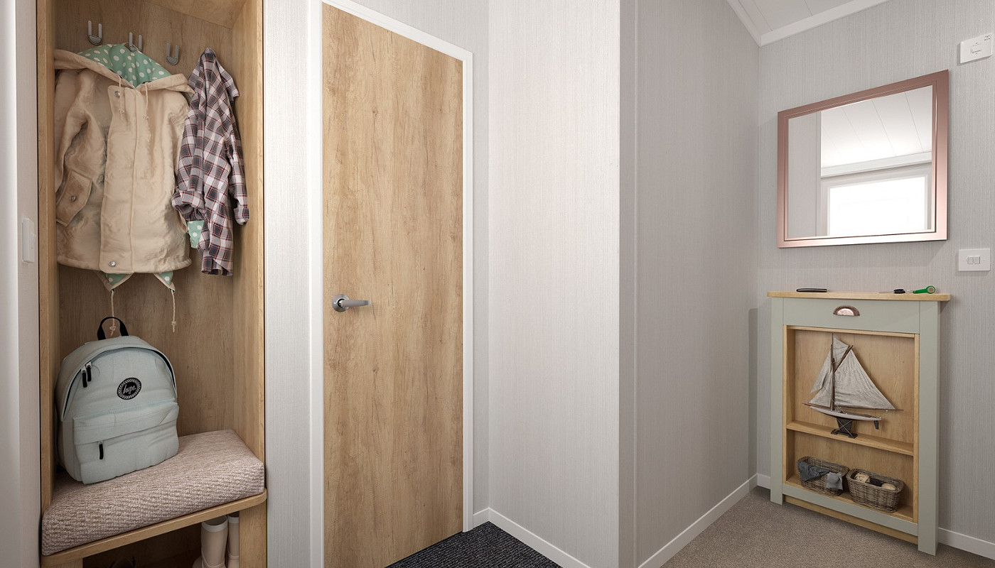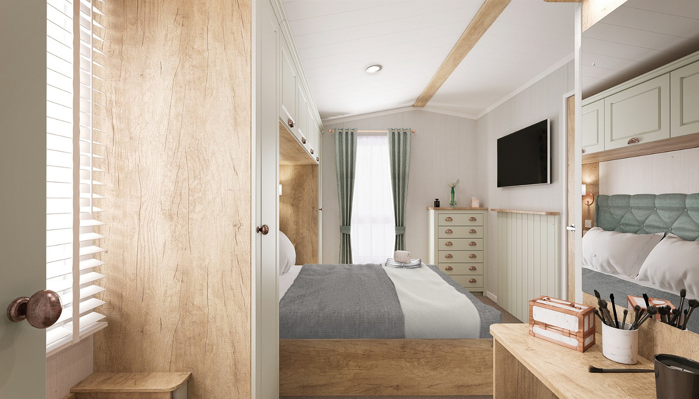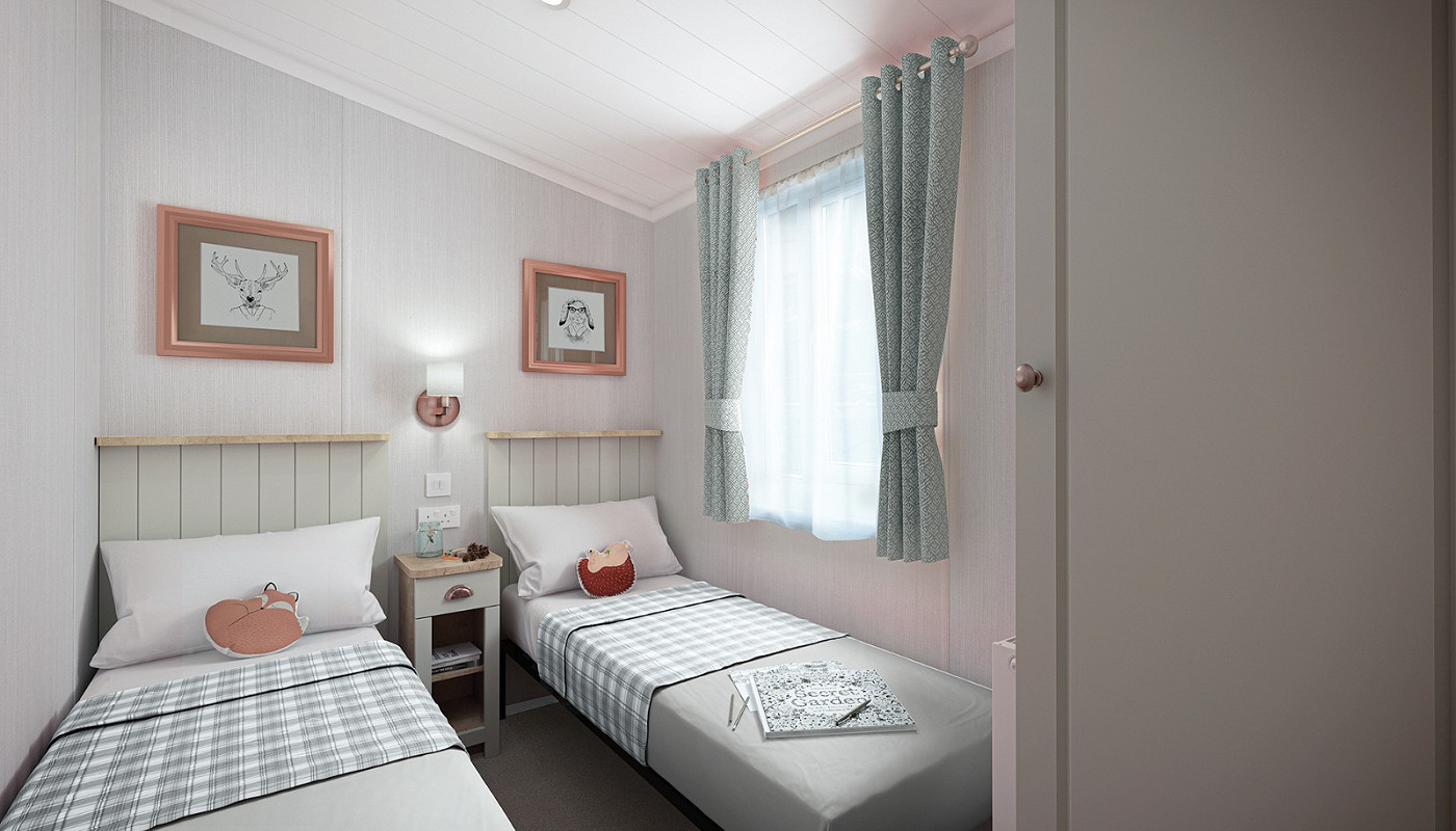 The main bedroom is fitted with a king size Duvalay™ Alba Ortho bed with lift up storage, as well as a large wardrobe, TV panel, window seat and vanity area, plus a dressing table with large mirror, lighting and storage. The nature-inspired second bedroom has twin single beds with panelled headboards, and all beds have Duvalay™ mattresses, enhanced with Crib 5 rated fabric.
