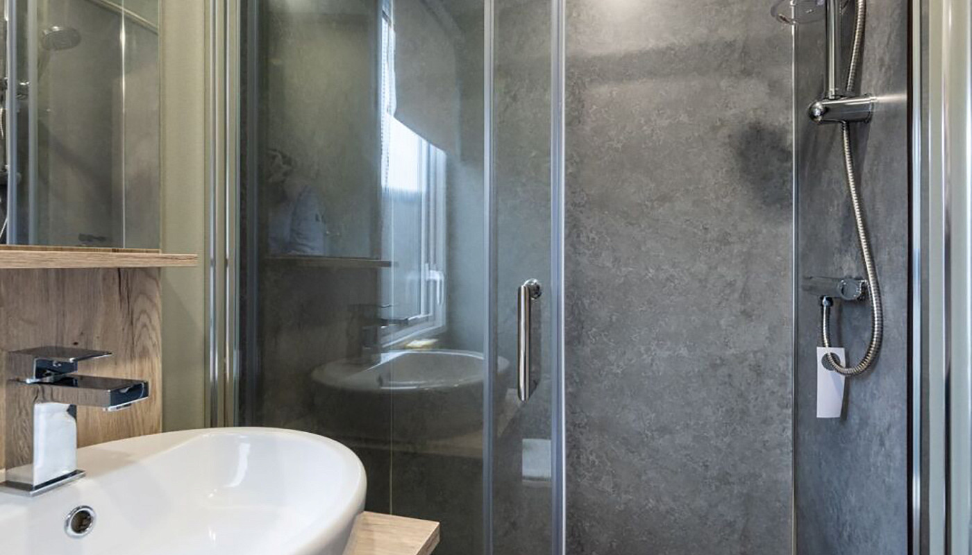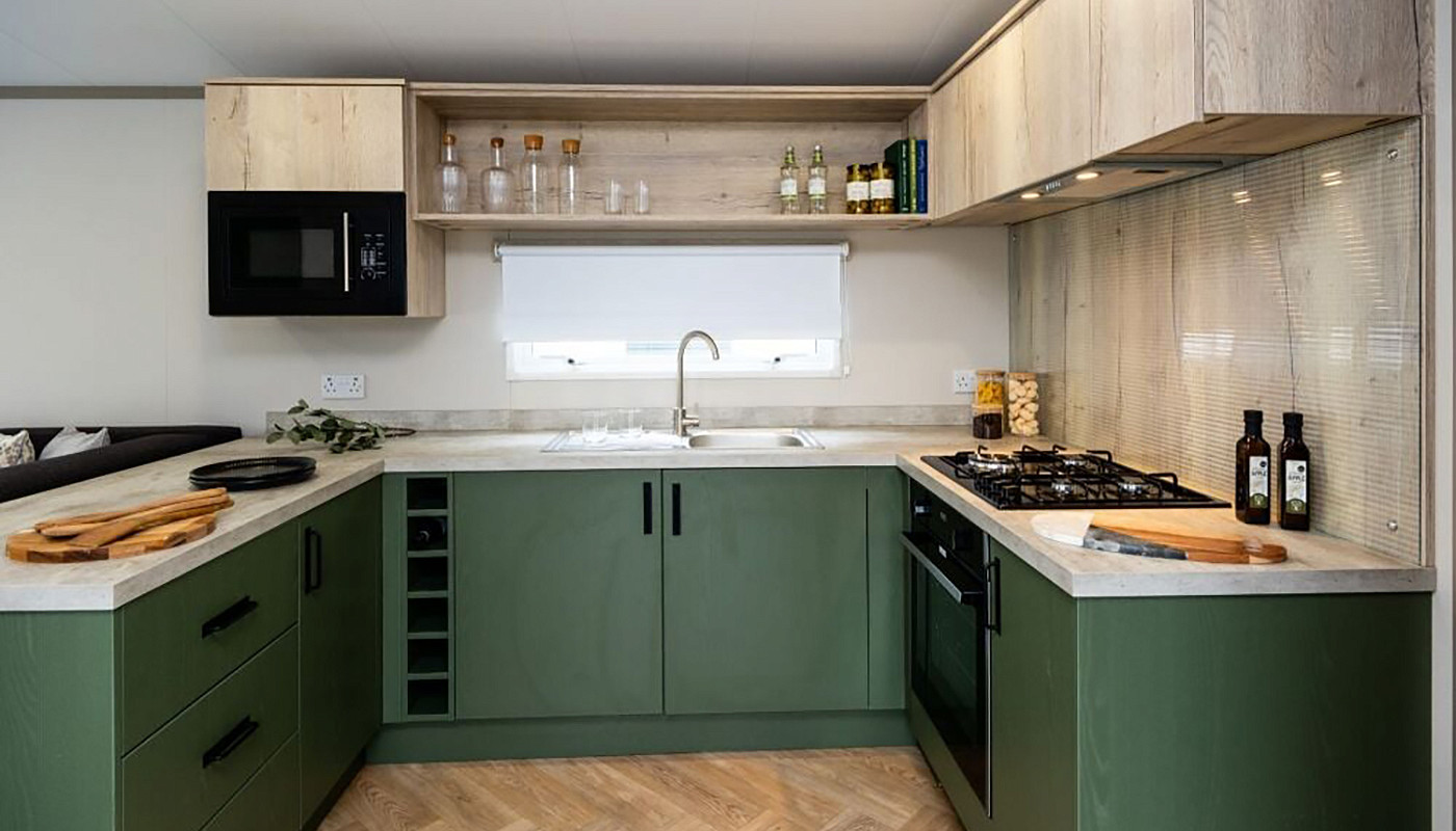 With Smoke Green kitchen units, enjoy easy holiday mealtimes with an integrated fridge/freezer, microwave and 4-ring gas hob. Or pull up a chair at the dining table while the nominated chef does the hard work. A Velux window to the kitchen makes the most of the long summer evenings.