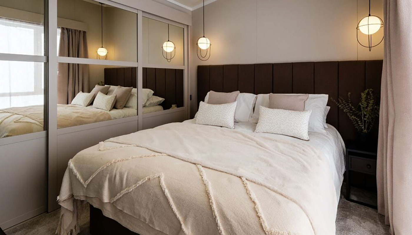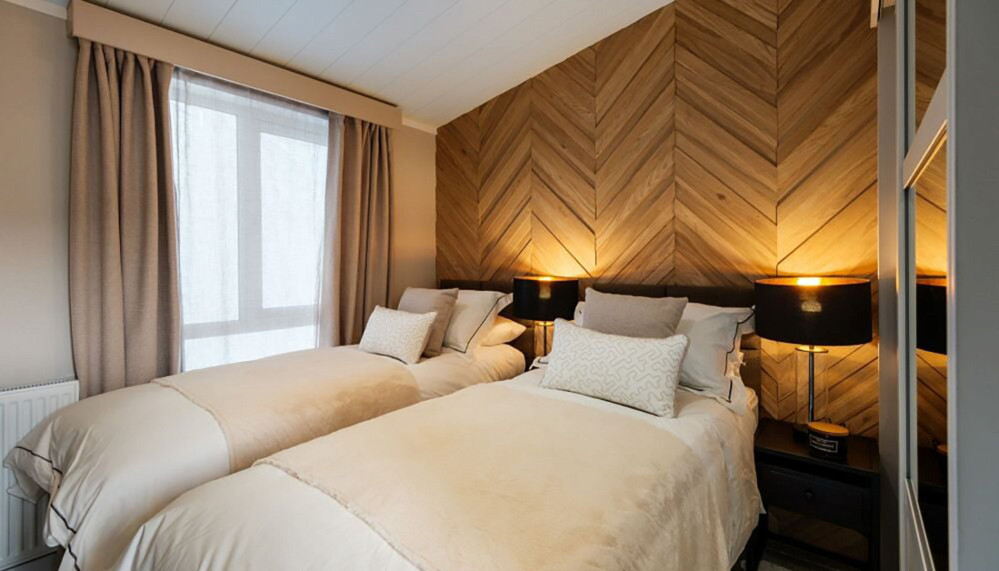 The master bedroom is bathed in natural light from the large window and you'll be snoozing in no time on the luxury kingsize ottoman lift-up bed with our comfy SnooVe mattress. With a dressing table to primp and preen, you'll be ready for an evening of relaxing on your deck. Your guests will also enjoy a soothing slumber in the twin room with a double bed, feature herringbone 3D feature wall, and wardrobe. And sleep…